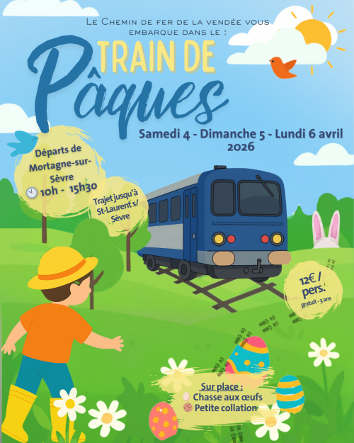 Au départ de Mortagne-sur-Sèvre, petits et grands monteront à bord de l’autorail pour un voyage unique jusqu’à Saint-Laurent-sur-Sèvre. Dès le départ, les enfants pourront observer des indices laissés par le Lapin de Pâques et se mettre dans la peau de petits détectives en quête de son trésor.
