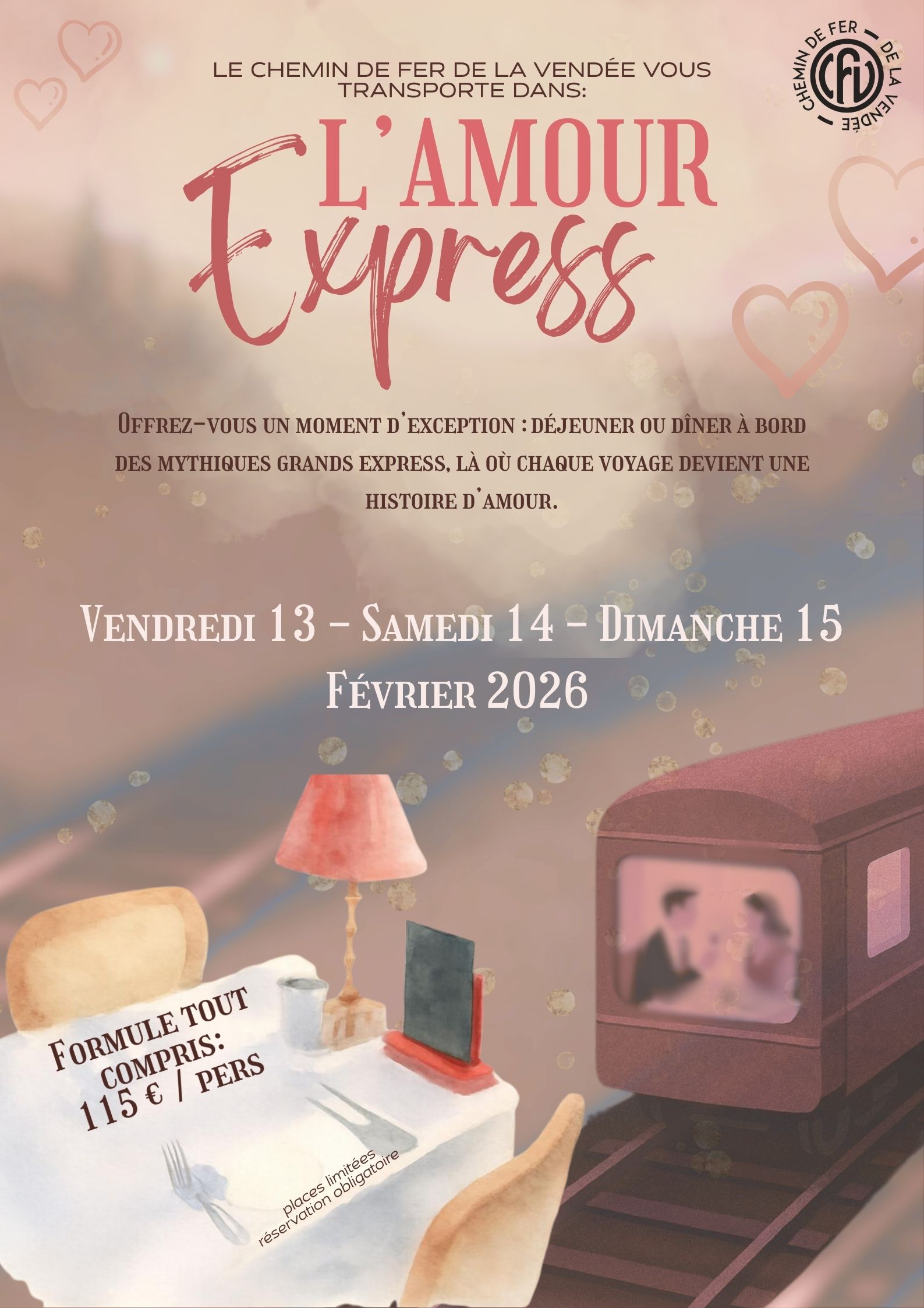 Embarquez pour un voyage unique sur les rails à l’occasion de la Saint-Valentin 2026. À bord de « l’Amour Express », laissez-vous séduire par le charme intemporel de nos authentiques voitures-restaurants C.I.W.L., véritables joyaux de l’histoire ferroviaire, où chaque détail raconte une histoire d’élégance et de raffinement.